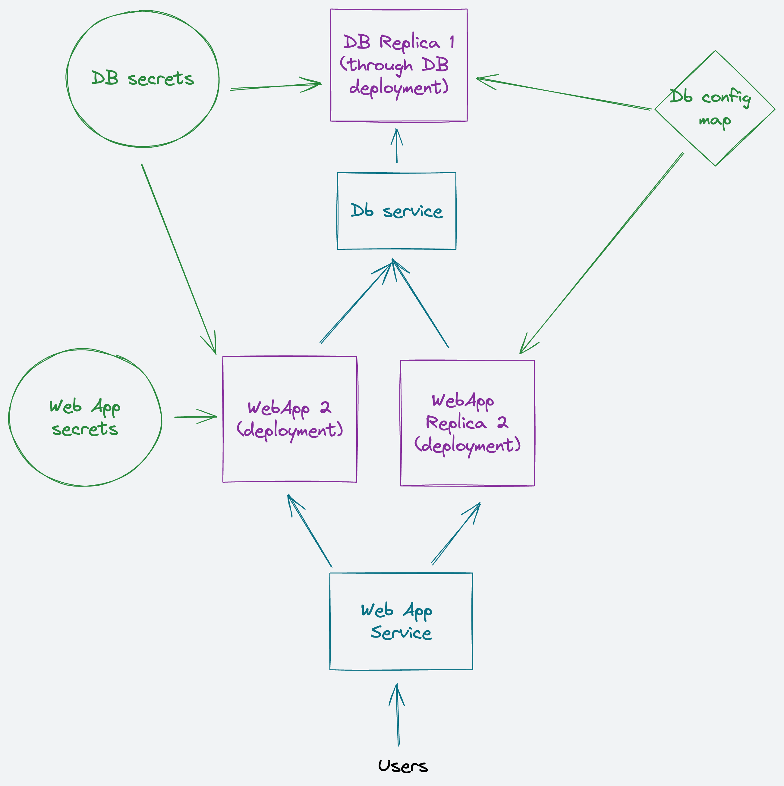 Likewise with the web app, we will need a Deployment, a Secret and the Service.