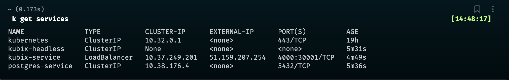 k get services where we can see a kubix-service, of type LoadBalancer, internal terminaisons and external onesBonuses time!