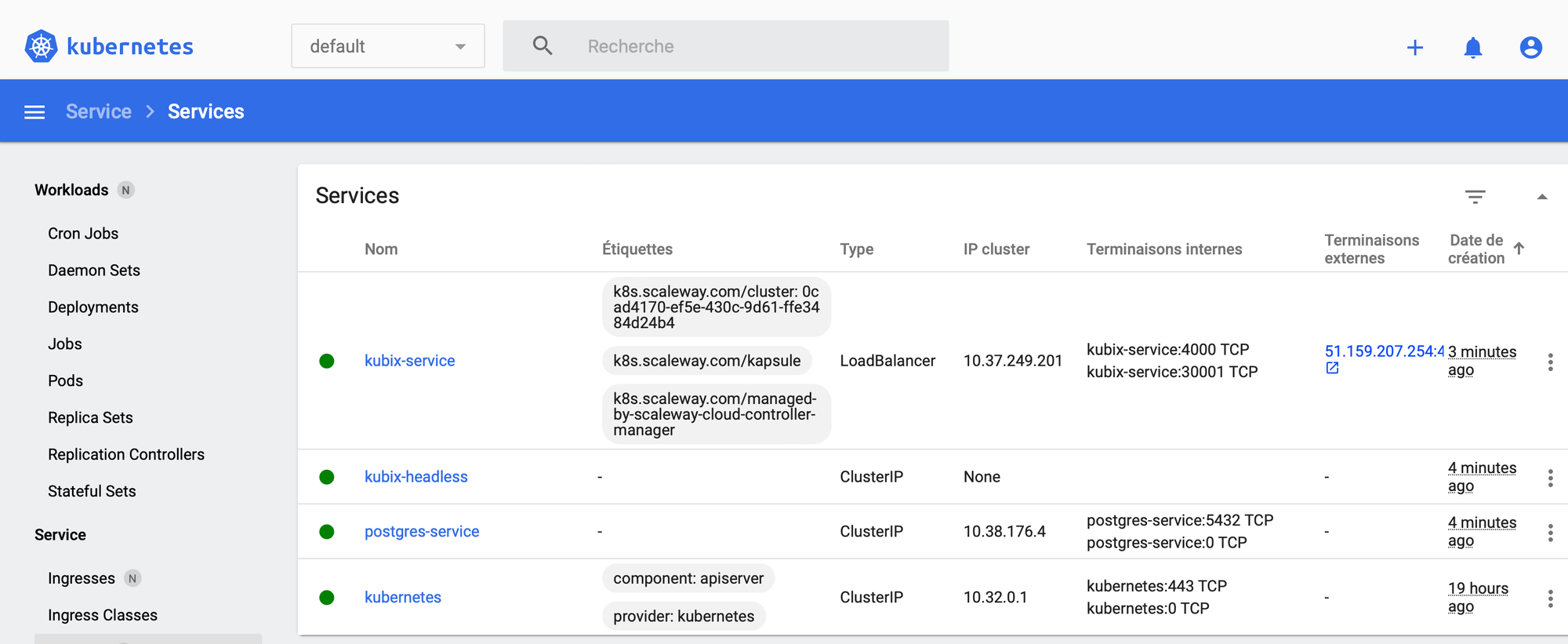 From the dashboard, we can click on the "terminaison externe" (or something else in English) for our kubix-service.